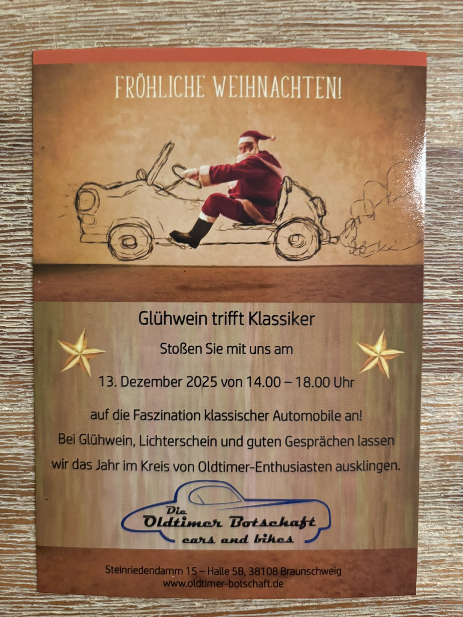 Glühwein trifft Klassiker in der Oldtimer Botschaft am 13.12.2025 14:00-18:00